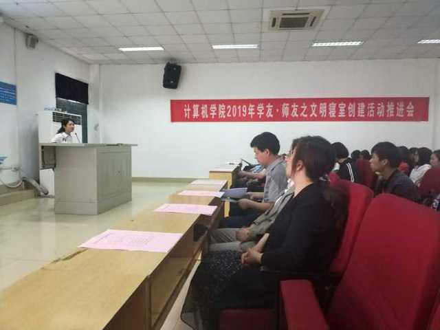 计算机学院党总支书记陈慧敏指出师友·学友活动是我校的品牌活动,希望同学们在各个职能部门领导的支持和指导下,以文明寝室创建为载体,践行全员育人理念,从卫生环境、安全秩序、学习风气、和文化氛围作为创建重点,切实改善学生寝室环境。要按照创建方案,真抓实干,争创文明标兵寝室。会上,辅导员张锐老师分享文明寝室创建做法,她提倡寝室所有成员共同制定寝室公约,营造属于自己的寝室名片。希望同学们以集五福卡形式(勤学福、友善福、欢乐福、团结福、向上福)完成寝室文明创建。学工办主任邓家桃做寝室火灾事故、财务安全、人身安全以及网络安全主题教育。学生会通报了四月份寝室卫生检查情况及存在的问题。最后与会领导与对接班级学生进行交流,并在文明寝室创建横幅上郑重的签上了自己的名字。