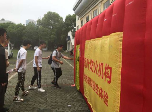 本次活动请到专业人士为同学们普及消防安全知识及求生方法。两位辅导员也多次强调道,火灾发生时会产生大量的浓烟,为避免吸入大量烟尘而昏迷,同学们要尽量在30秒内逃离现场。接着,老师要求班里同学分3队进入火灾模拟道具中进行体验,道具真实的模拟了火灾发生时的情况,漆黑一片并伴有浓烟。3个小队依次进入并在规定时间内到达了出口。最后老师进行了总结,消防演习活动顺利结束。