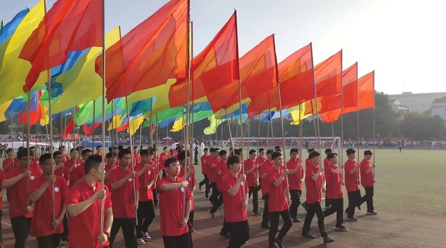 由我院2019级64名男生组成的彩旗方队在运动会开幕式上精彩亮相。摄影 张智琪