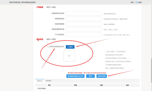第九步:填写相关信息后,上传就业协议照片(如无扫描条件,用手机自带相机拍照),检查无误后,点击保存送审即可
