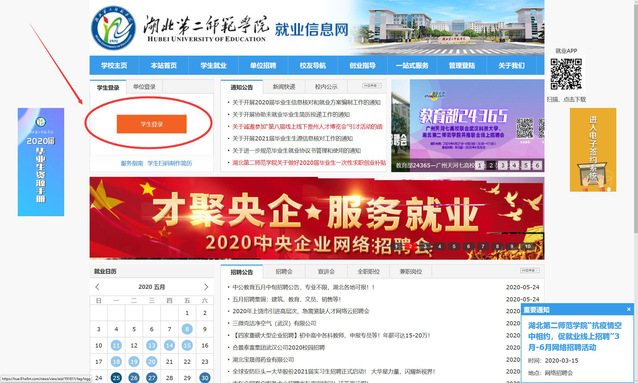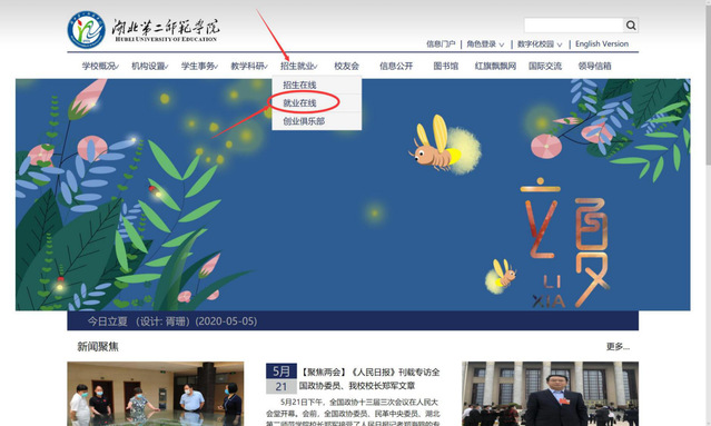 第一步:进入湖北第二师范学院官网:www.hue.edu.cn,点击最上方招生就业栏目,选择就业在线