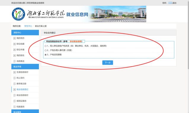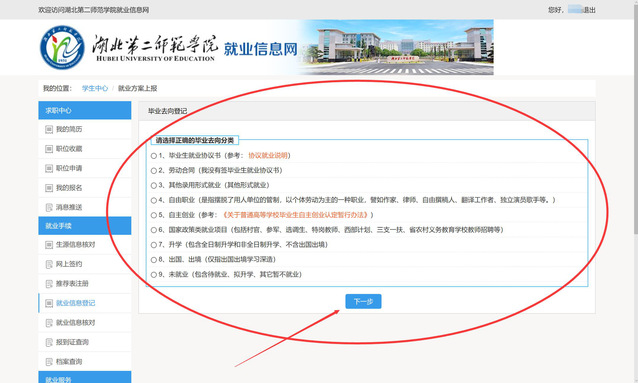 第六步:选择就业方式:三方协议签约选1,合同签约选2,…自主创业选5,升学选7,出国选8。未就业不提交