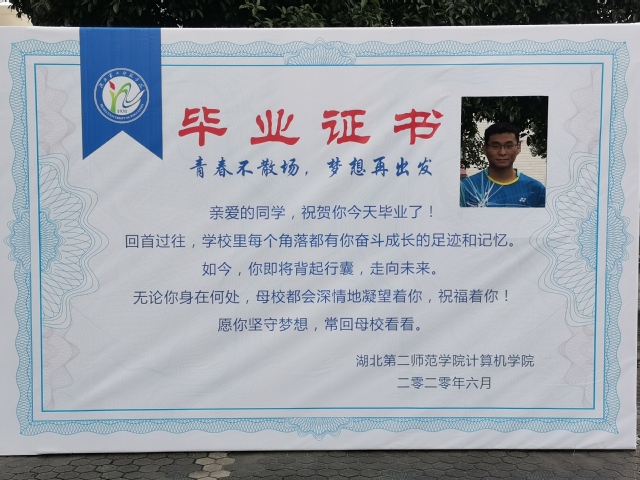 10号楼楼下,有一张特制的超大“毕业证书”。毕业证书上写满了学校对毕业生的不舍和期待,吸引了不少毕业生来此留影。在超大号毕业证书旁边,还有一幅毕业留念墙,墙上是12个毕业班的合影。