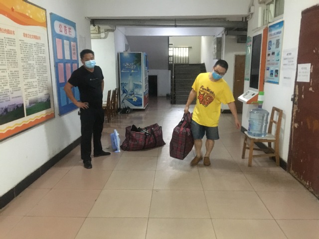 教师甘胜丰博士一直坚守在学生宿舍帮忙一趟又一趟搬运和转运行李