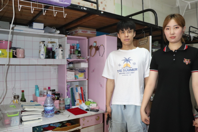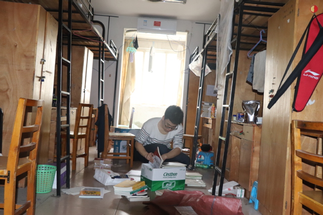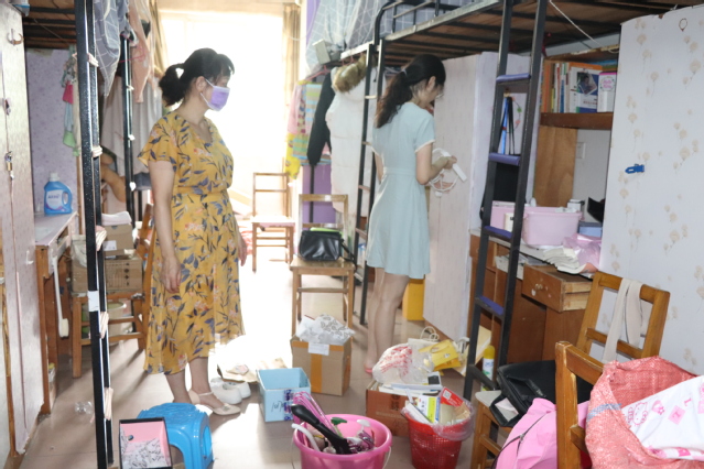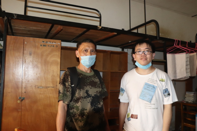 毕业生高帅把自己的床桌打扫的干干净净,垃圾都收拾好带走,离开时跟父亲在自己的书桌前留影