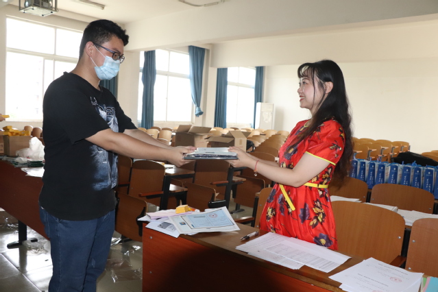 学院辅导员给毕业生发放各类证件材料。