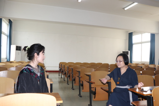院长杨莉与毕业生黄辛格交流谈心。