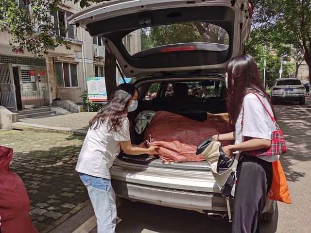 学院辅导员陈婧(左)帮毕业生搬运行李