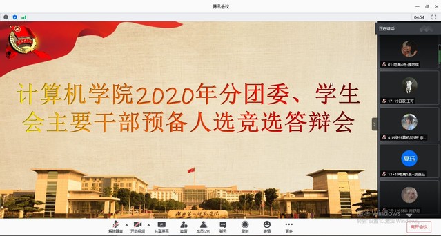 本网讯(记者 王姝婷)8月11日下午2点由计算机学院分团委学生会组织的2020年分团委、学生会主要干部预备人选竞选会顺利开展。此次活动由学生会主席杨慧兰主持,此外还邀请到分团委学生会副书记张鸣鹤,学生会辅导老师邓重阳担任评委。各位参加竞选的学生会干部,干事们参与此次活动。