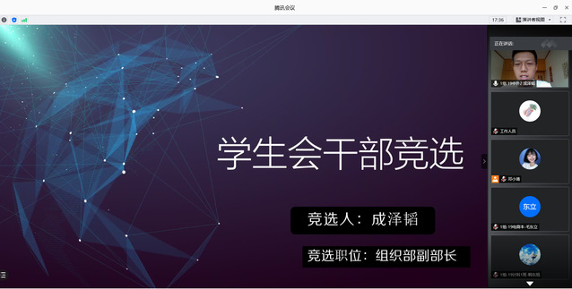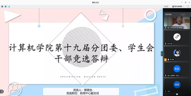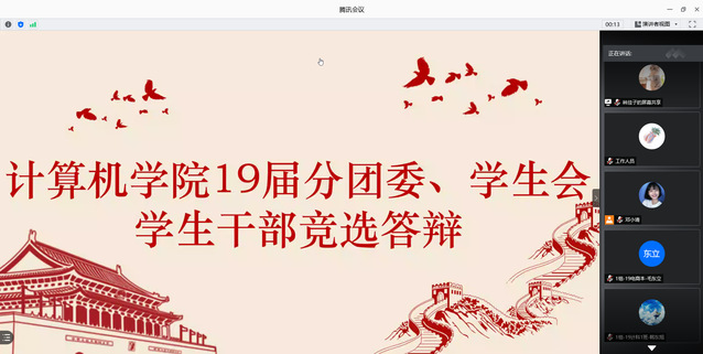 本网讯(记者 杨延)8月26日下午2点,由计算机学院举办的19届分团委学生会干部竞选答辩会在腾讯会议召开。此次会议由计算机学院分团委组织部副部长王名琪主持,邀请学生会辅导老师邓重阳出席,计算机学院分团委学生会全体干部成员参加此次会议。