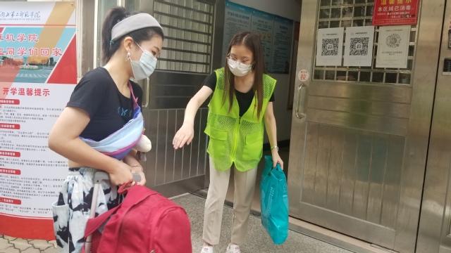 早上七点,学校南北大门处、西一和西六两栋学生楼下,学院分党委书记陈慧敏、副书记熊坤鹏、副院长陈宇、王海军、辅导员老师、多位教学办老师、教师,都身穿绿色马甲、佩戴着红袖章,到岗迎接阔别已久的同学们。