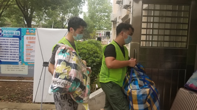 一名被帮助的女同学表示,“返校前一直担心行李太多没办法运进来,但是对接我的同学特别热心帮忙,扛行李累的满身大汗,真的很谢谢他。”