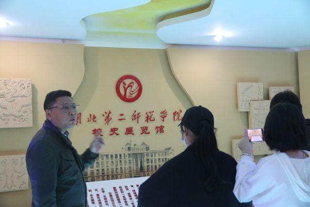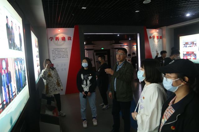 在图书馆前集合留影后,同学们在辅导员及班导师带领下有序进入校史馆。图书馆馆长林彬为同学们详细介绍了学校历史沿革、发展成就等。参观学校建筑分布时,林彬提问同学们:为什么图书馆位于学校的中心?有同学答“要以学习为中心”,林彬表示肯定并补充道:是为了让所有同学都能以最近的距离到达图书馆。