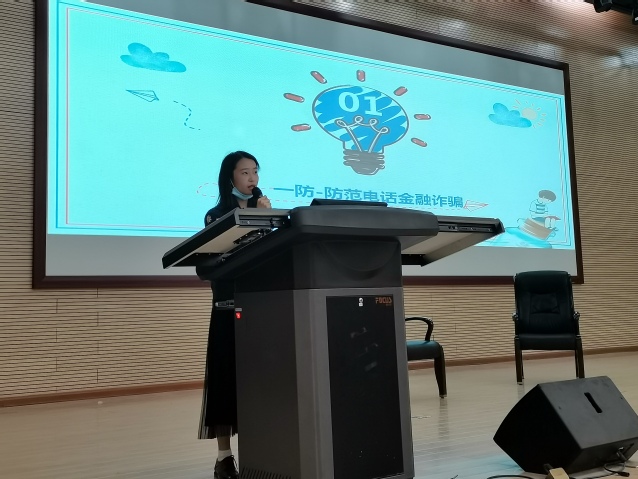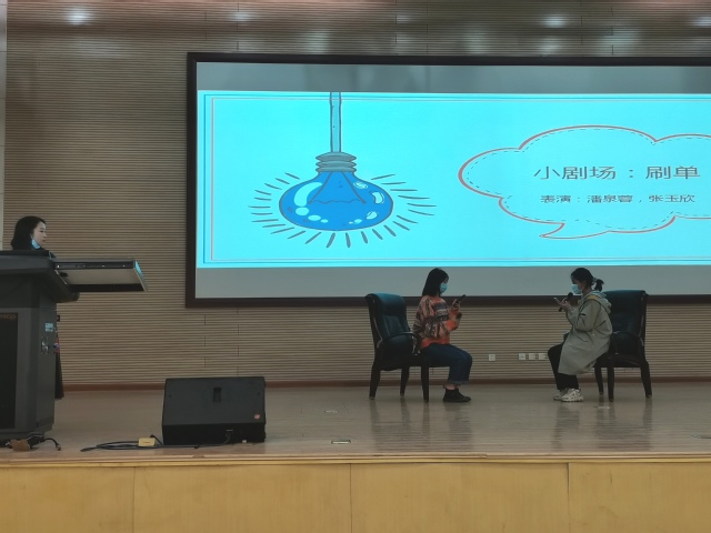 “一防”是指防电信诈骗。会上,主讲人通过视频展示了电信诈骗的种类和具体手段。此外,宣讲团以话剧形式演绎了几个常见的诈骗类型,是活动的一大亮点。三段话剧分别是“黄铜诈骗”“校园贷”和“刷单”,给同学们上了一场活泼生动的安全教育课,提醒在场的同学们提高警惕。
