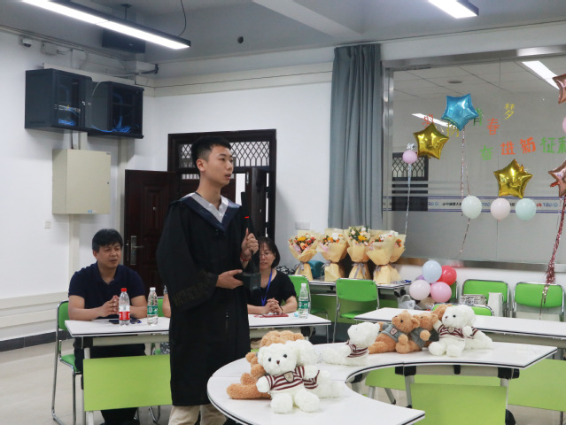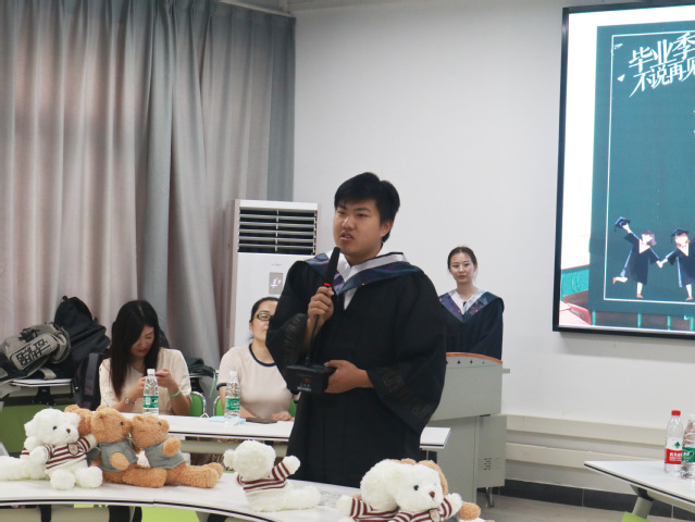 开场后,班长郝阳播放了自己精心制作的视频。视频是全班四年来的点滴记录,不少同学看的红了眼眶。接着,郝阳邀李家涛、邓毅成、但枭三位同学,分别分享了自己的四年成长故事。