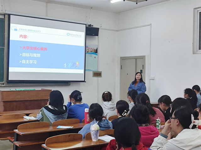 其后又邀请到秦艳姣老师为同学们进行大学生核心素养和自主学习的讲解,她提到大学生应尽早树立目标,制定规划,通过自主学习来发展自身的核心素养,以后才能更好地适应社会发展的要求。同时她也为同学们介绍了自主学习、体验学习、协同学习、问题学习的方式,能帮助同学们提高学习的效率,大家听后都感触颇深。