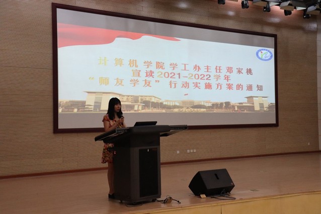 大会第十项,计算机学院学工办主任邓家桃致辞,并宣读2021-2022年“师友·学友”行动实施方案的通知。