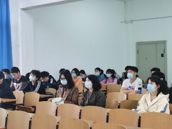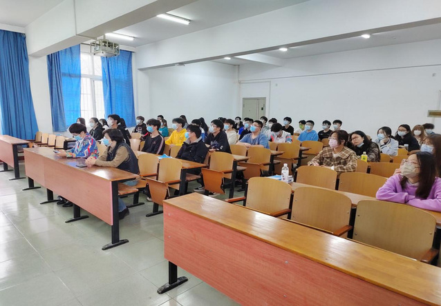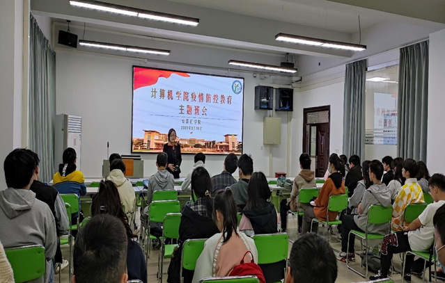 图为计算机学院党委书记陈慧敏给21级教育技术学1班同学开展疫情防控主题班会