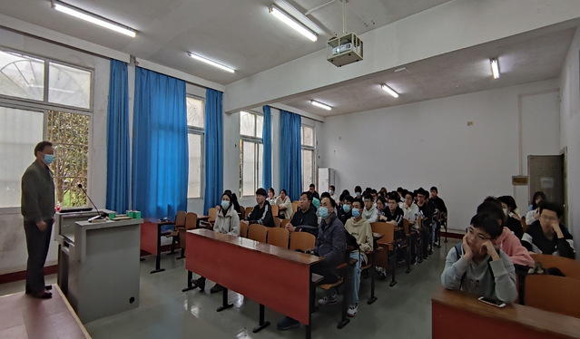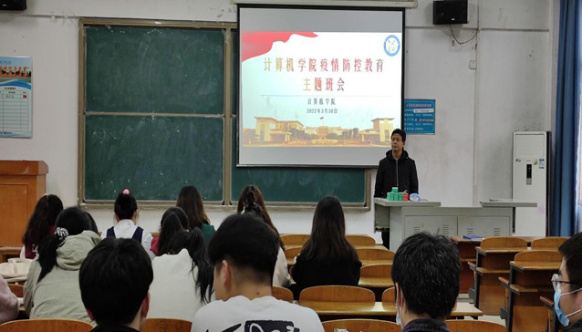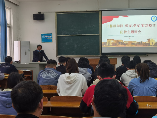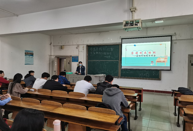图为计算机学院党委副书记熊坤鹏给21级学生开展疫情防控主题班会