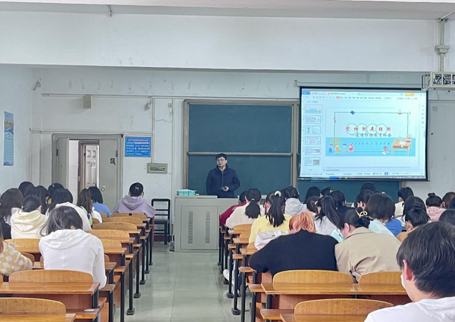 图为信息化办公室副主任万润泽、杨戌老师正在给20教技和21电商班的同学开主题班会