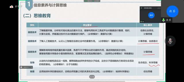 随后,段芬简要分析介绍信息素养与计算思维的培养方式,重点从核心素养、思维教育、计算思维三方面进行分析解读,指出培养过程中所出现的问题,提出领会学科核心素养内涵,全面提升学生信息素养等四个重要教学建议,从项目整合等教学方式持续改进。