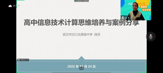 本网讯(记者梅一峰 钟子奇)11月24日晚,计算机学院组织开展的“探索人工智能发展 赋能信息科技教育系列讲座”第一期开讲,学院教育技术学专业师生共聚云端参加讲座。武汉市汉口北高级中学信息中心主任、中学一级信息技术教师段芬应邀开讲,讲授《高中信息技术计算思维培养与案例分享》。计算机学院副院长杨鹤主持会议。
