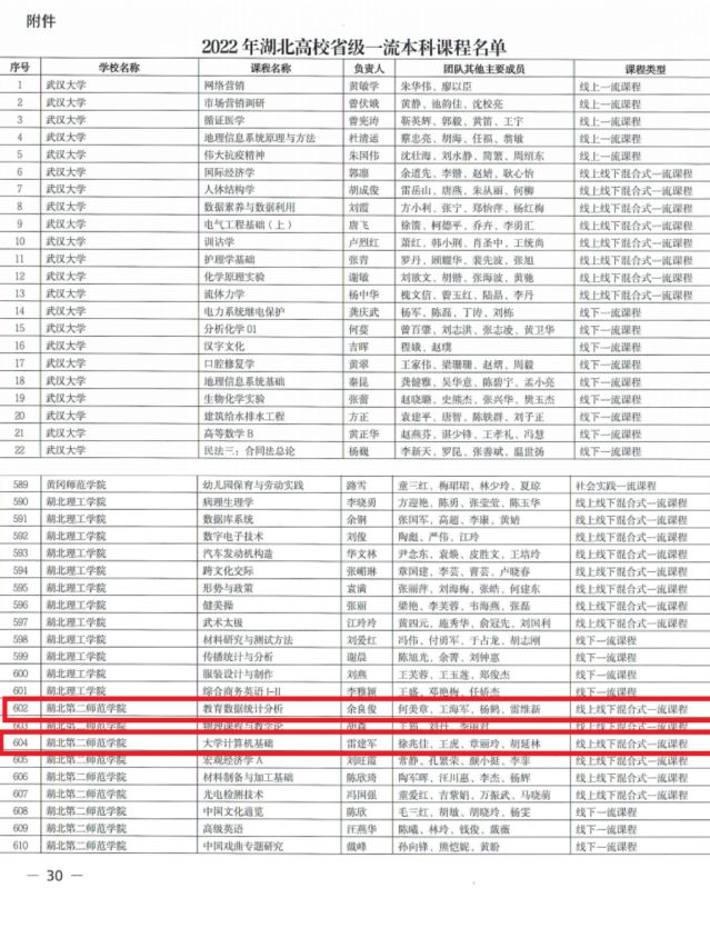 本网讯(通讯员肖沫晔)近日,湖北省教育厅公布了2022年度省级一流本科课程认定结果,我院2门课程被认定为省级一流本科课程,均为线上线下混合式一流课程。