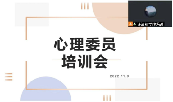 本网讯(通讯员 熊冰冰)为了更好地了解大学生在大学期间生活和学习的身心健康,提高大学生的心理素养,计算机学院心理站于10月20日开展了线上秋季心理委员培训活动。此次培训主要针对的是20级、21级、22级班级心理委员。本次培训由心理协会指导老师冯诚主讲。