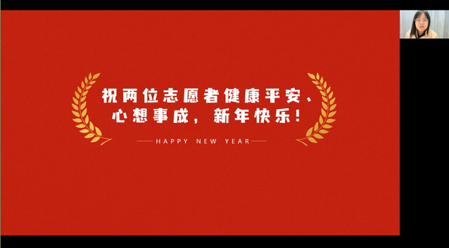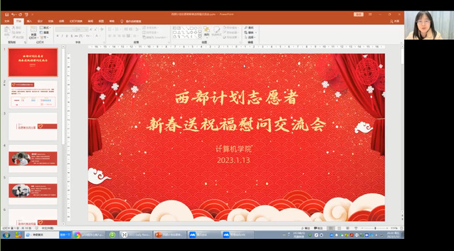 本网讯(通讯员肖沫晔)1月13日晚,计算机学院师生代表与两名2022届赴新疆开展服务的西部计划志愿者共聚云端,聊家常,话新春,送祝福。学院党委书记陈宇、副书记王敏出席。