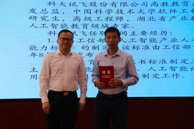 夏力代表学校对雷大正教授的加入表示欢迎和祝贺,并为雷大正教授颁发“湖北产业教授”聘书。他指出,当前,学校正在大力推进人工智能助推教师队伍建设,并朝着“达标申硕、更名大学”的宏伟目标阔步前进,希望雷大正教授为学校高质量发展建言献策、贡献力量,推进科大讯飞和我校的合作,助力人才培养。