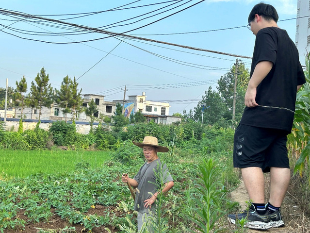 图为志愿者在向农民伯伯询问快岭村主要农作物和生长情况。中国青年网通讯员 葛锦瑶 供图
