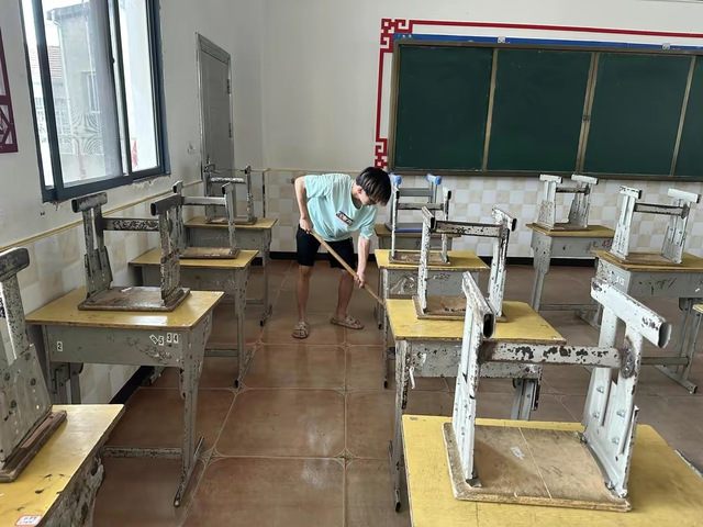 图为志愿者打扫教室。周瑶供图