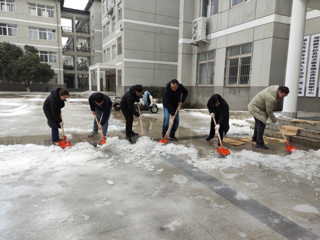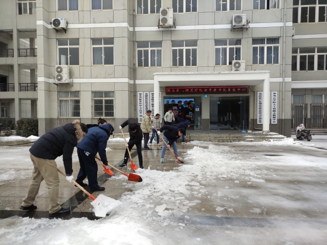 在“冰雪大扫除”行动中,教师们不畏严寒,手持各种除雪工具,扫的扫,铲的铲,除雪现场一度热情高涨。老师们铆足干劲、奋力挥锹,将主要路面的积雪、冰块清理得干干净净。