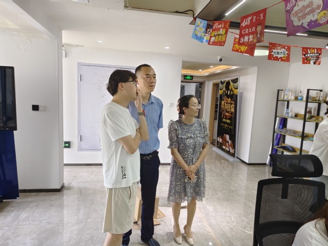 陈宇一行在武汉格莱信息有限公司CEO周俊的带领下参观了园区企业,对各企业发展历程、业务开展情况、企业用人需求等方面进行深入了解。