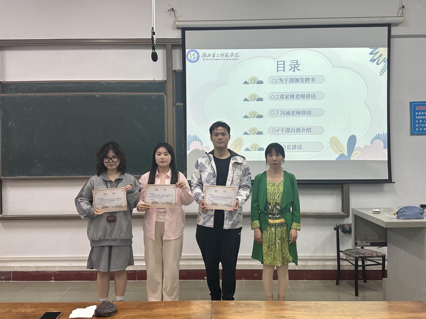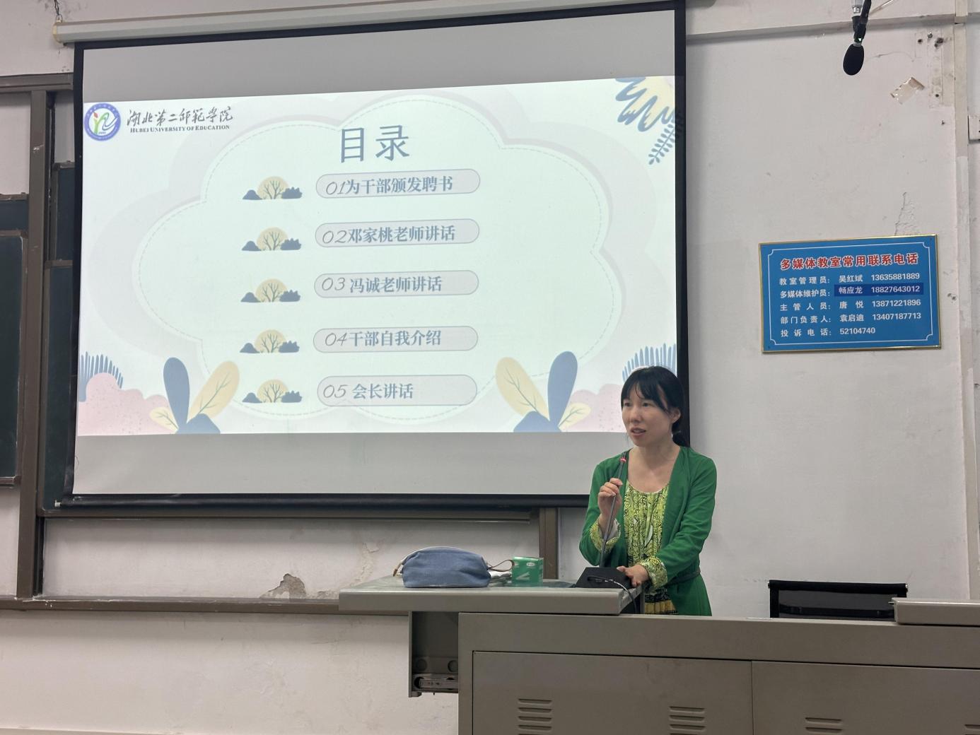 会议第一项,计算机学院心理辅导站站长邓家桃为往届学生骨干颁发聘书,大家共同见证了干部们在过往的工作中付出的辛劳。