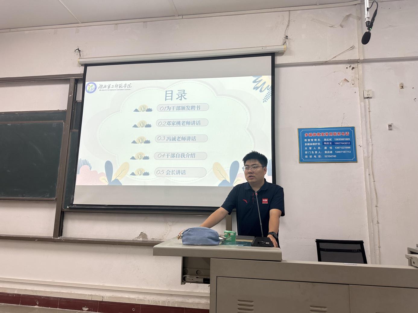 会议第三项,心协指导老师冯诚为大家介绍了心协的主要职责及如何成为一名合格大学生,他用以身作则,精诚团结,终身学习,勇攀高峰以及不忘初心五个词语讲述了如何做好一