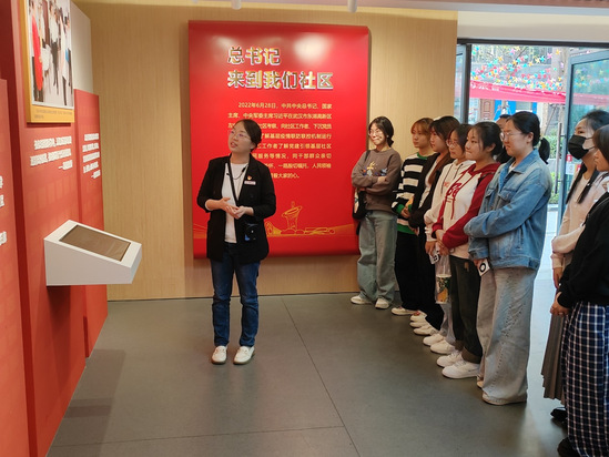 在参观过程中,金成静书记讲述了智苑社区如何从当初国有企业葛化集团棚户区逐步改建成当下宜居社区的光辉历史。在党群服务中心、共享客厅、红色驿站等社区综合服务设施场所,学生们深入了解了智苑社区在社区管理、阵地建设、党群工作等方面的特色亮点。