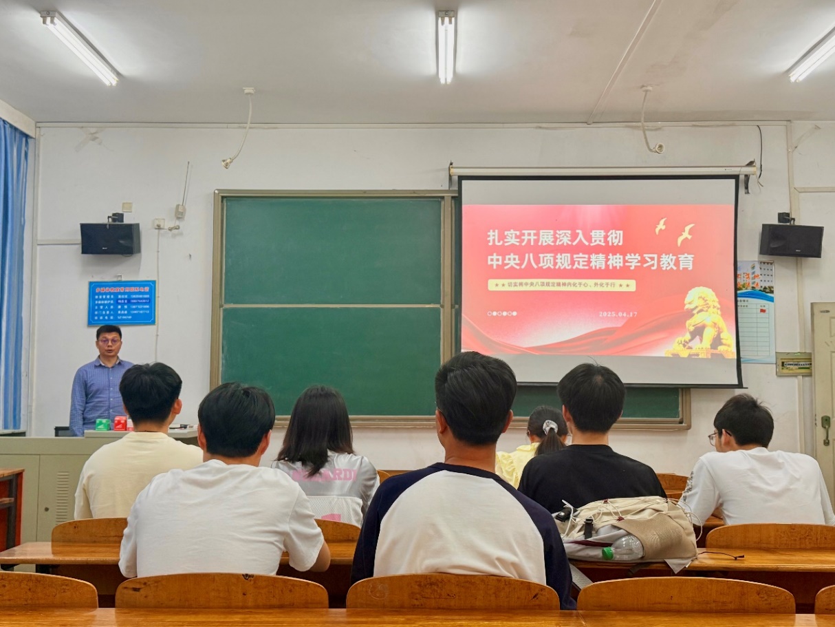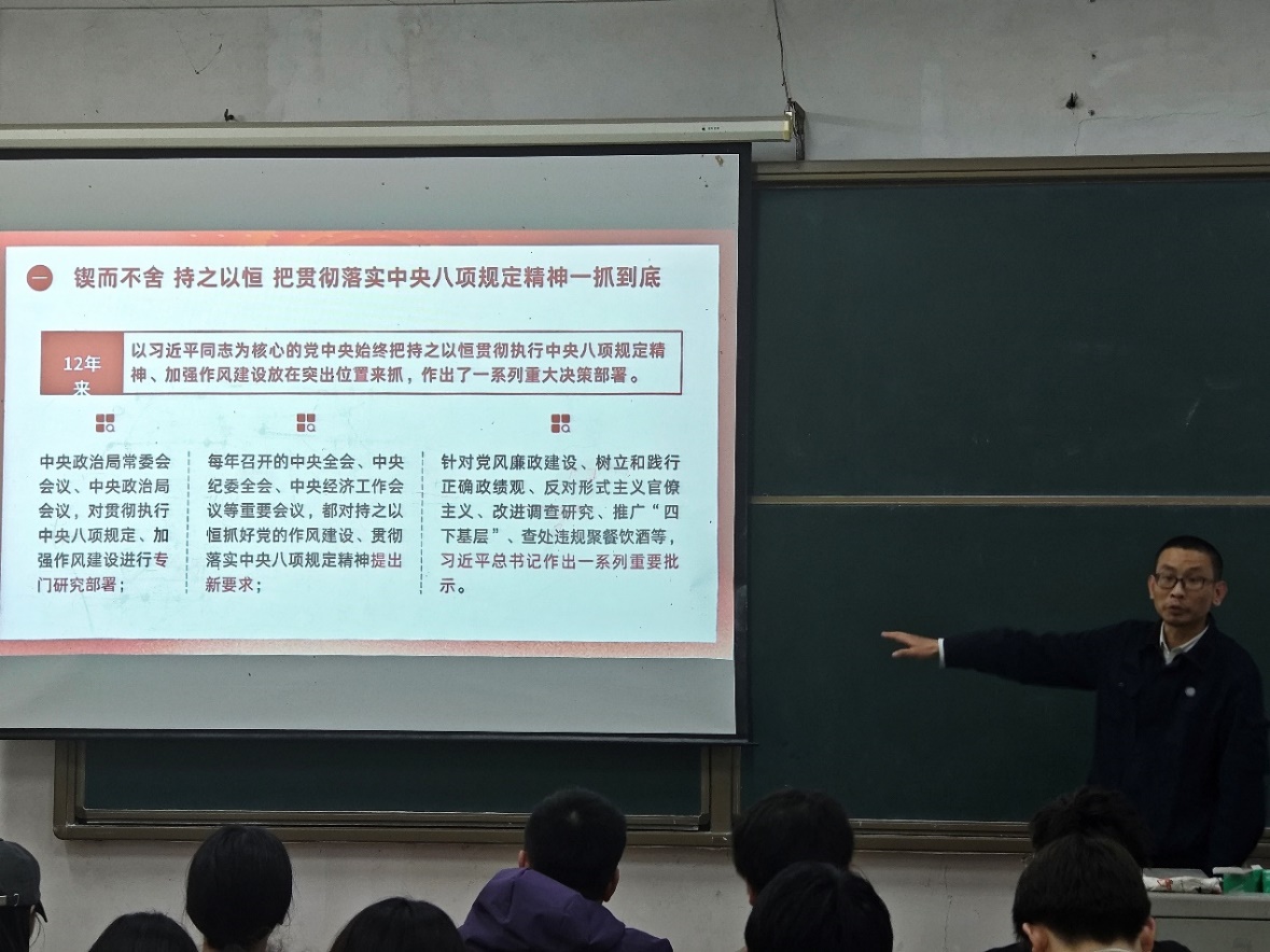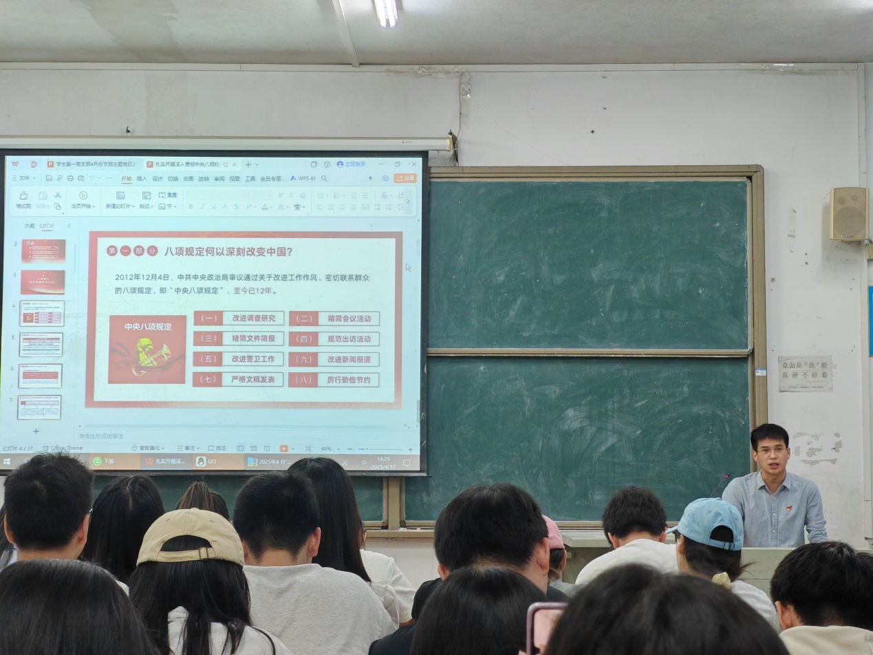 邓重阳在授课时着重强调:“八项规定是每一名党员必须严守的行为准则,学生党员更应从日常小事着手,培养严谨务实、艰苦奋斗的优良作风。”