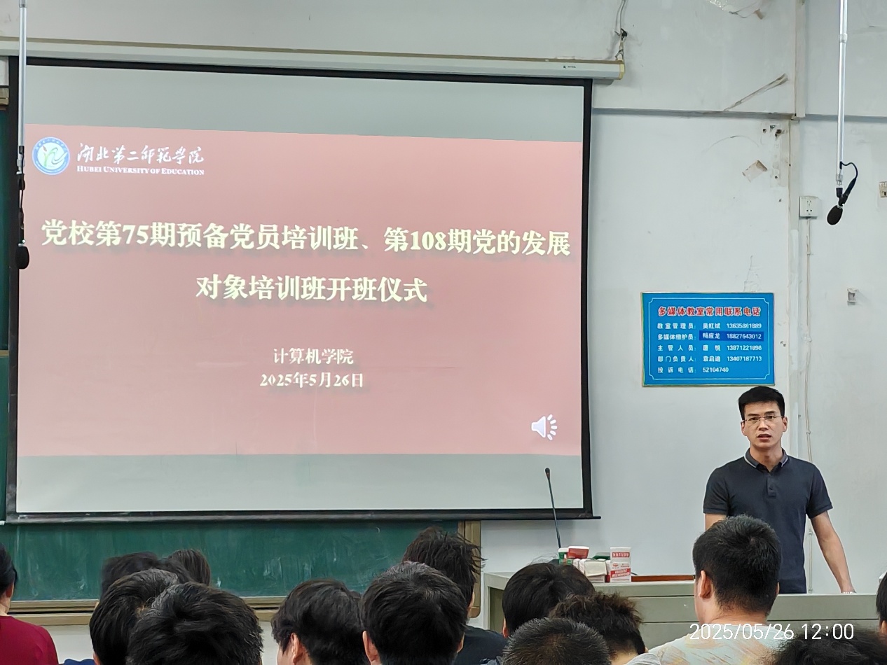 本网讯(通讯员 彭雁彬)2025年5月26日12点,计算机学院分党校第75期预备党员培训班、第108期党的发展对象培训班开班仪式暨第一节党课在十号楼10301教室隆重举行。计算机学院党委副书记王敏、组织委员王志红参加活动,第75期预备党员和第108期党的发展对象培训班全体学员参加学习。活动由计算机学院第一党支部书记邓重阳主持。