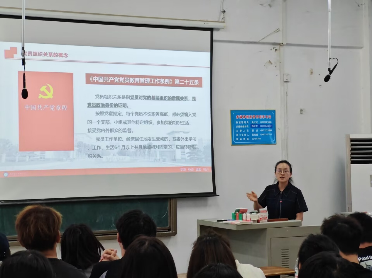 随后,王敏副书记以"党员组织关系转接"为主题,为学员们讲授了第一节专题党课。在近两个小时的授课中,王书记结合工作实际和具体案例,从基本概念、转接凭证、介绍信填写规范以及不同情形下的转接流程等四个方面进行了深入细致的讲解。特别是在讲解毕业生党员组织关系转接时,她通过列举往年工作中遇到的典型问题,提醒学员们要注意时间节点和相关材料的准备。整场授课既有理论高度,又具有很强的实践指导性。