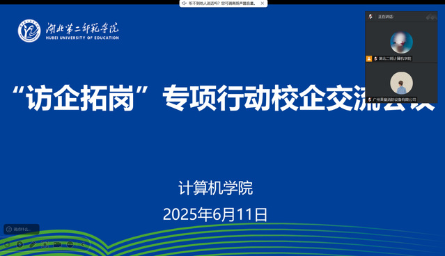 本网讯(通讯员冯诚)6月11日,计算机学院通过腾讯会议平台,与广州莱曼消防设备有限公司、武汉敏岛汽车零部件有限公司、武汉溯古互联网科技有限公司等三家企业代表举行线上访企拓岗校企合作交流会。计算机学院党委书记陈宇、党委副书记王敏参加会议。