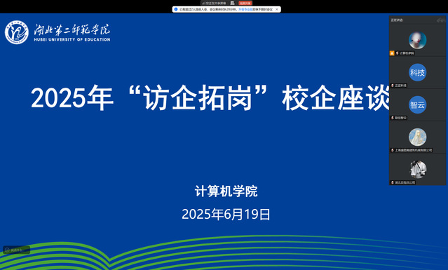 本网讯(通讯员冯诚)6月19日,计算机学院通过腾讯会议平台,与湖北正宜科技发展有限公司、联信智云(武汉)科技有限公司、上海盛图南建筑机械有限公司等六家企业代表举行线上访企拓岗校企合作交流会。计算机学院党委书记陈宇、党委副书记王敏参加会议。