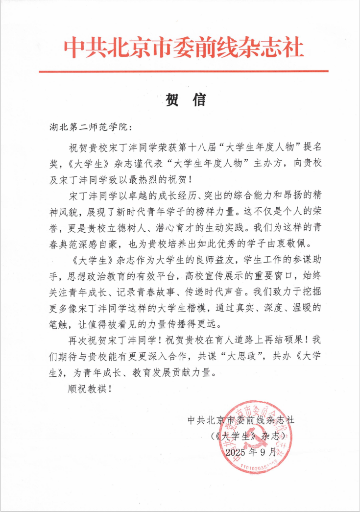 2025年10月,中共北京市委前线杂志社发来贺信,祝贺湖北第二师范学院计算机与人工智能学院2024届毕业生宋丁沣入选2024年第十八届大学生年度人物提名奖。