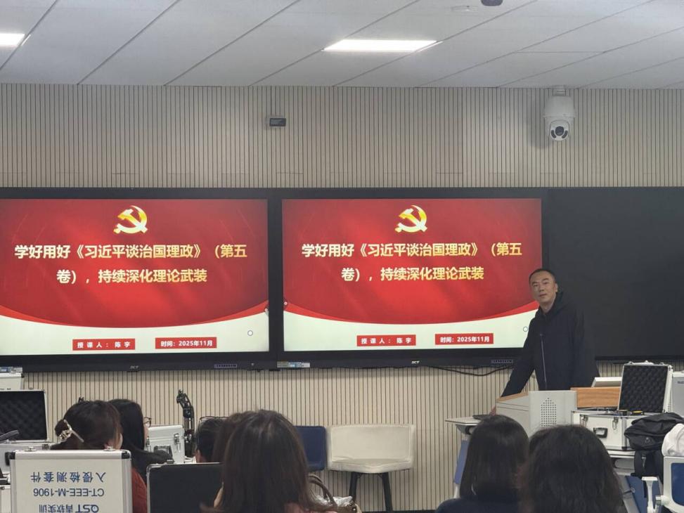 本网讯(通讯员 杨辰熙) 2025年11月14日下午,计算机与人工智能学院党校在S4202教室举行专题党课。学院党委书记陈宇以“学好用好《习近平谈治国理政》第五卷,持续深化理论武装”为主题,为全体教工党员、第114期党的发展对象培训班全体学员授课。