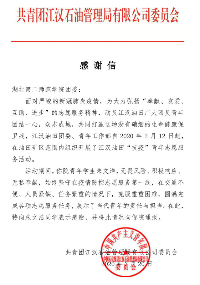 在感谢信里,共青团江汉石油管理局有限公司委员会这样表示:“在交通不便、人员紧缺、任务繁重的情况下,(朱文浩)克服重重困难,圆满完成各项志愿服务任务,展示了当代青年的责任与担当。”