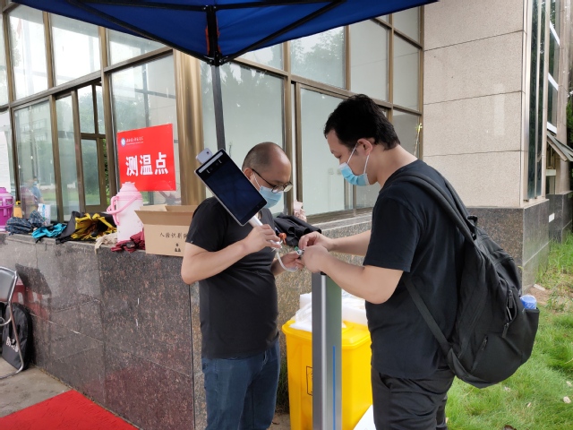 当日下午,智慧云天(深圳)技术有限公司几名技术人员在学校南北两个大门处安装调试门禁设备,并教会学校安保人员使用。一经安装调试完毕,门禁设备立刻派上了用场,比之前人工查验身份和体温枪测温速度快了不少。学校安保人员和进出的毕业生都表示设备使用十分方便,既准确,又快速。