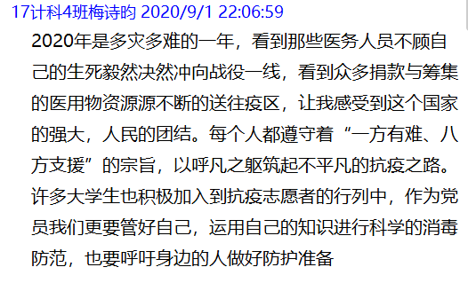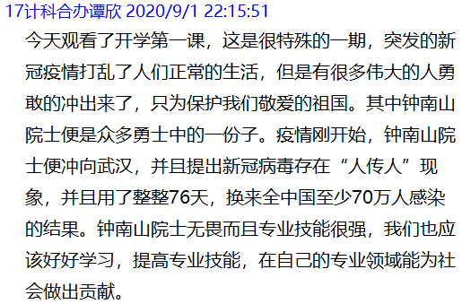 一支部的学生党员同志感慨万千。谭欣同志表示,突发的新冠疫情打乱了人们正常的生活,但是有很多伟大的人勇敢的冲出来了,只为保护我们敬爱的祖国。其中钟南山院士便是众多勇士中的一份子。钟南山院士无畏而且专业技能很强,我们也应该好好学习,提高专业技能,在自己的专业领域能为社会做出贡献。