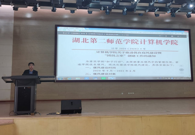 本网讯(通讯员袁鑫茹杨承娇)10月30日中午12点半,计算机学院优良寝风建设暨“团员之家”创建活动在新图书馆2号学术报告厅正式启动。学院党委副书记熊坤鹏出席会议,各班级团支书、寝室长及宿舍楼楼栋长、层长参加。