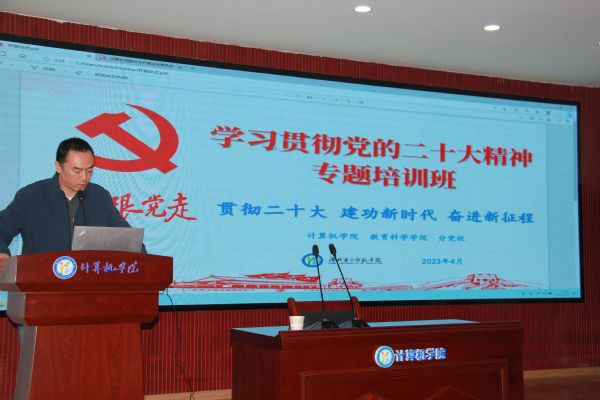(通讯员 任京 梅一峰)4月27日下午,由计算机学院、教育科学学院分党校联合举办的“学习贯彻党的二十大精神”专题培训班在实验楼S4210举行。校党委副书记胡兴出席开班典礼并作主题报告,计算机学院、教育科学学院领导班子、全体党员教师参与学习。