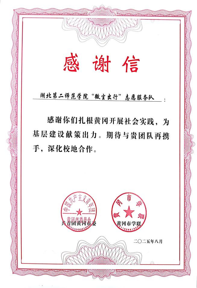 本网讯(通讯员 冯诚)近日,共青团黄冈市委向我校“微尘出行”志愿服务队发来感谢信。对“微尘出行”志愿服务队在2025年全国大学生暑期文化科技卫生“三下乡”社会实践活动之“爱心托管班”专项实践活动中的精彩表现予以表扬和感谢。